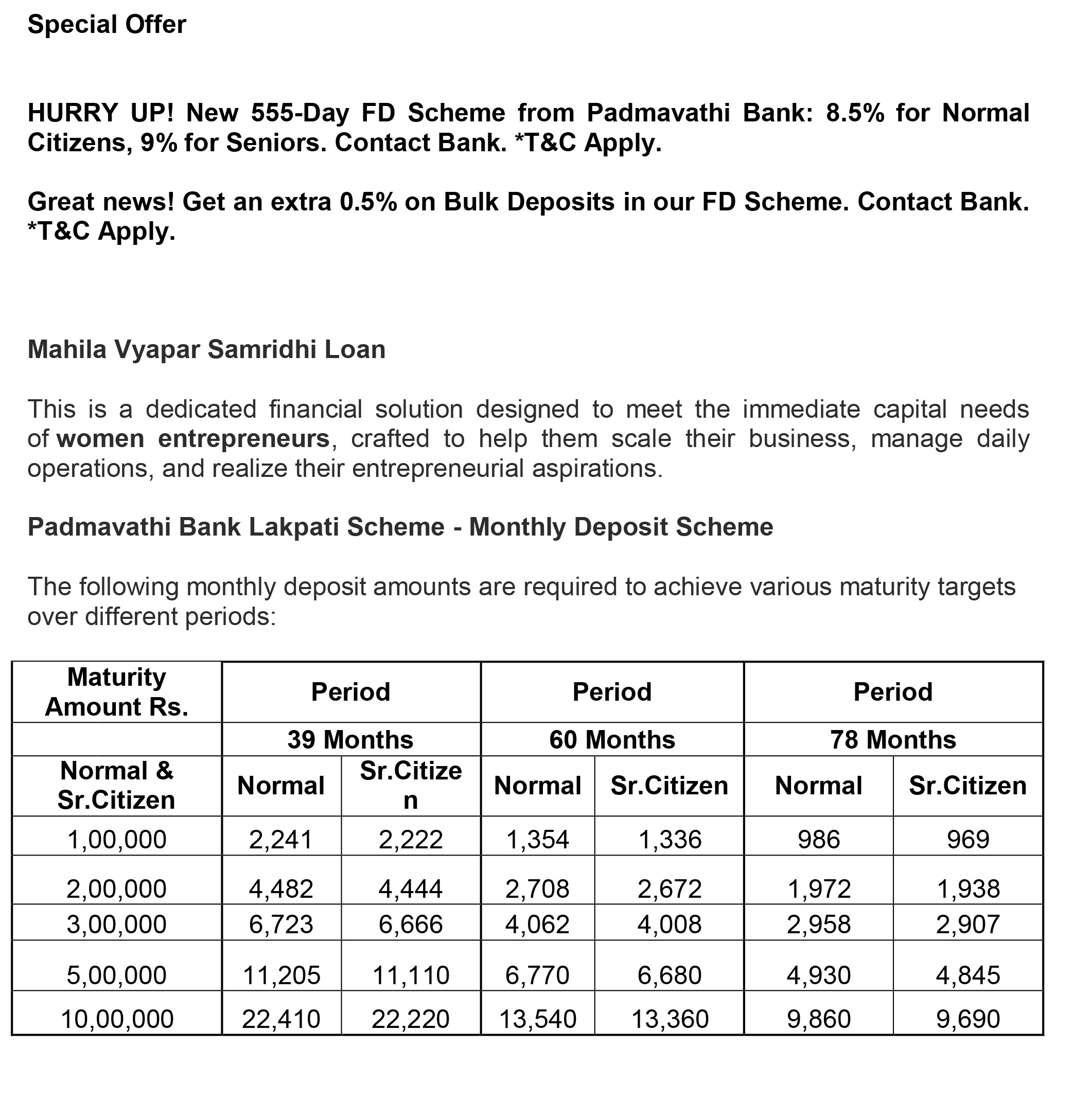 Padmavathi Co Operative Urban Bank Limited was established in the year 1998 and completed 27 years of services to the customers.